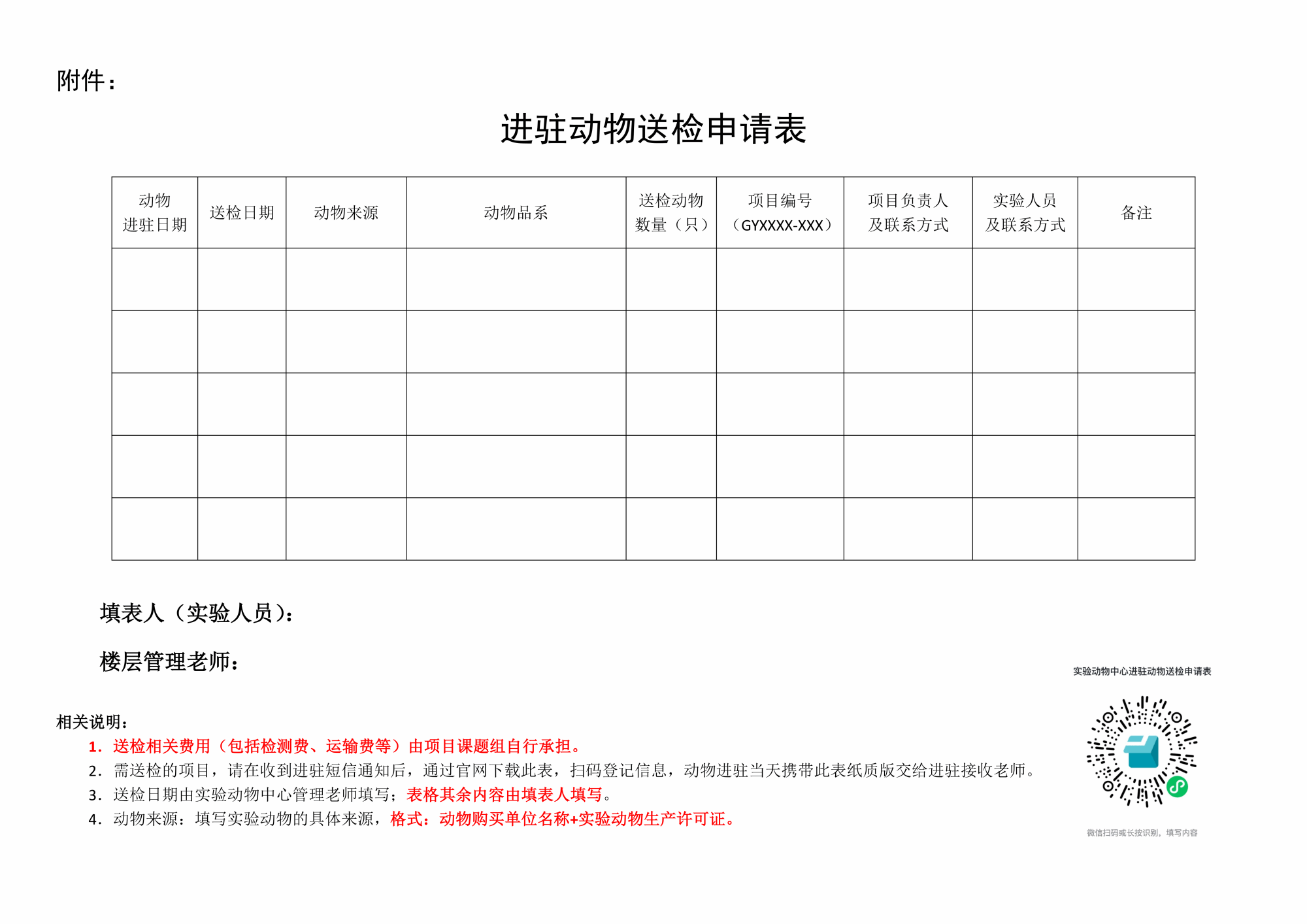 (二)实验动物中心官网下载中心下载《进驻动物送检申请表》,扫码登记信息,动物进驻当天携带此表纸质版交给进驻接收老师;