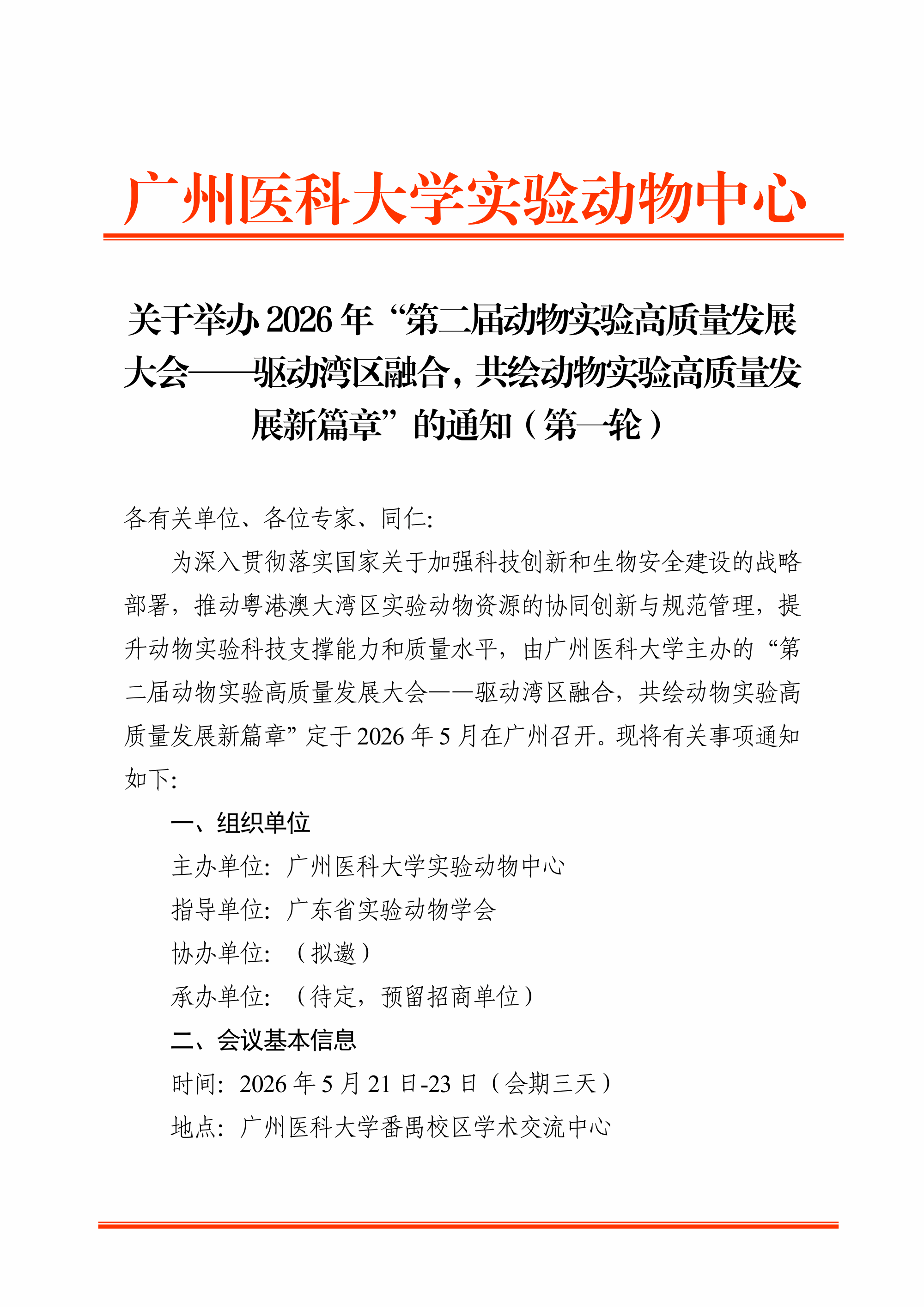 关于举办2026年“第二届动物实验高质量发展大会——驱动湾区融合,共绘动物实验高质量发展新篇章”的通知(第一轮)