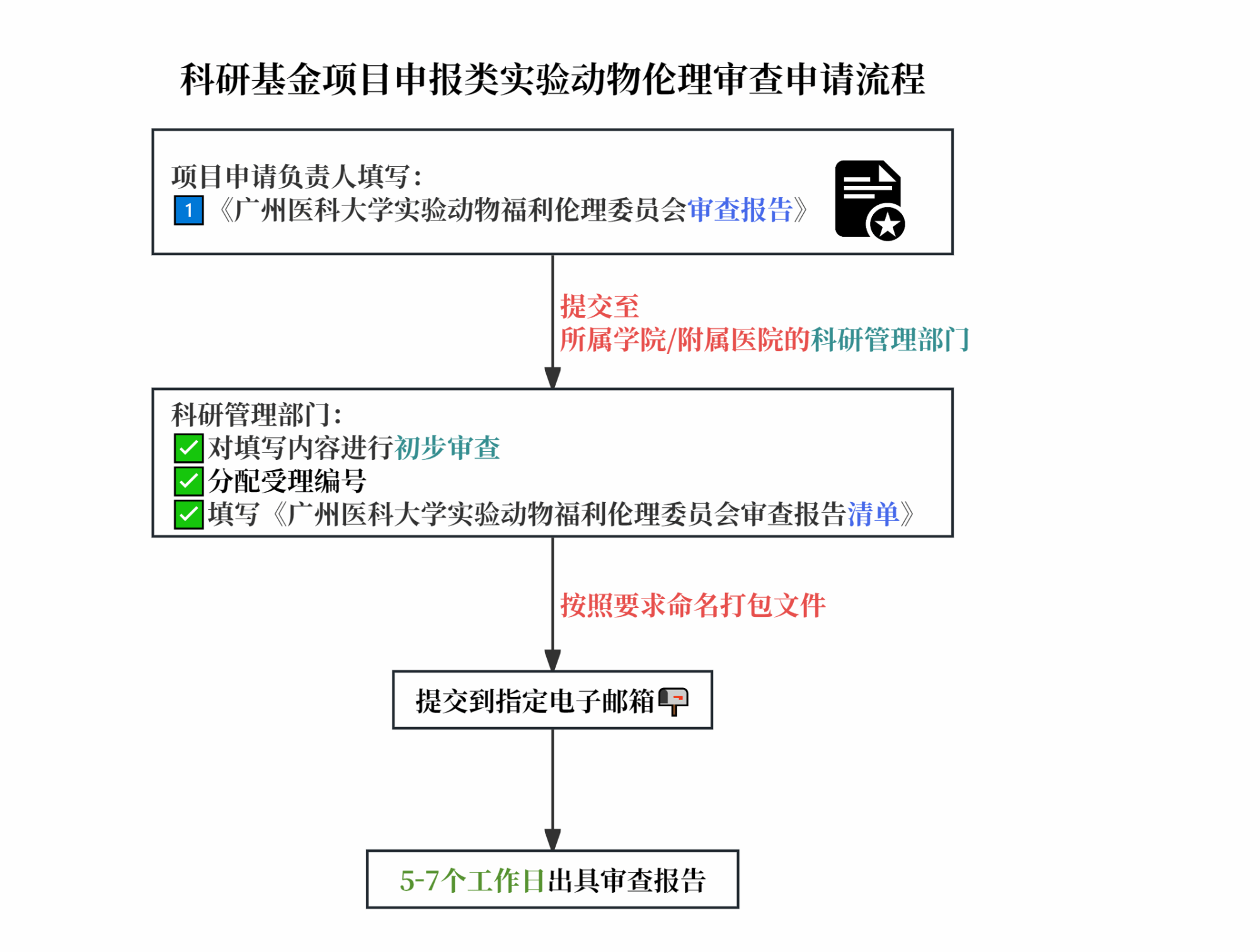 1. 项目申请负责人填写附件2:《广州医科大学实验动物福利伦理委员会审查报告》后,提交至各学院、各附属医院的科研管理部门,具体填写说明请参考附件内批注部分。