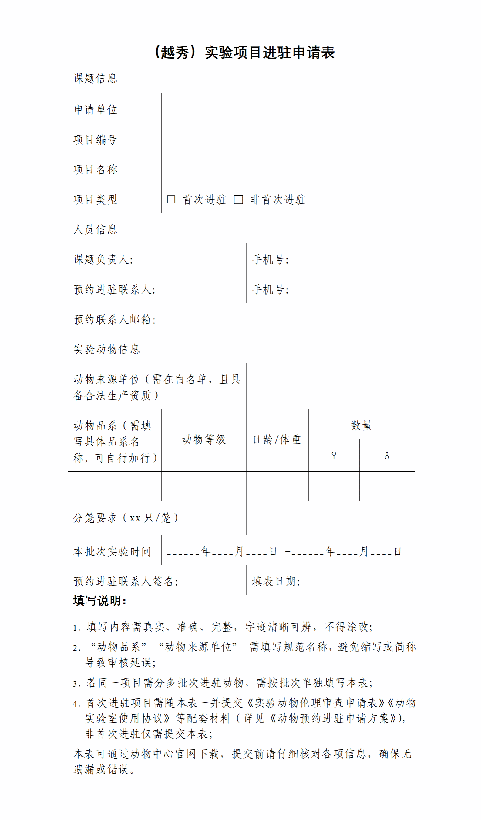 4、首次进驻项目需随本表一并提交《实验动物伦理审查申请表》《动物实验室使用协议》等配套材料(详见《动物预约进驻申请方案》),非首次进驻仅需提交本表;